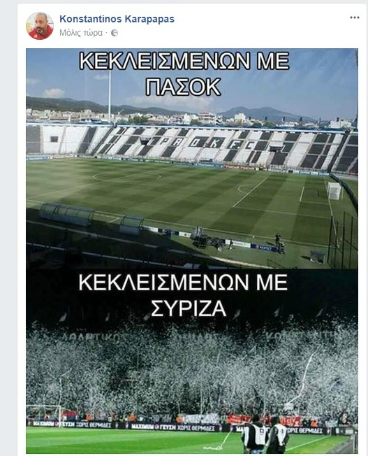 Ο διευθυντής επικοινωνίας της ΠΑΕ Ολυμπιακός, Κώστας Καραπαπάς, έκανε το ποστάρισμά του στο Facebook με αφορμή το γεγονός ότι το ΠΑΟΚ – ΑΕΚ θα γίνει απόψε με την παρουσία κόσμου.