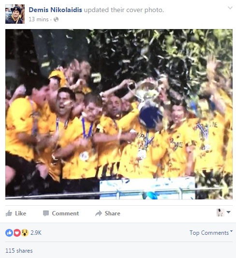 Έτσι με τη λήξη του τελικού του ΟΑΚΑ και τη νίκη με 2-1 επί του Ολυμπιακού, ο Νικολαΐδης έσπευσε να ποστάρει στο προφίλ του στο Facebook μία φωτογραφία από την απονομή του τροπαίου στους παίκτες του Στέλιου Μανωλά. Μία φωτογραφία, μάλιστα, που έσπευσε να κάνει φωτογραφία εξώφυλλου στο προφίλ του.