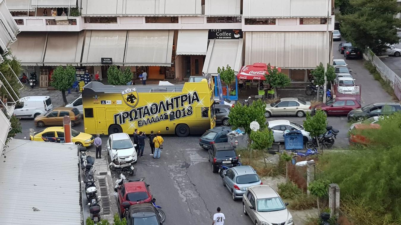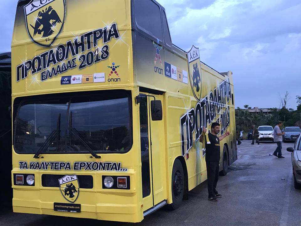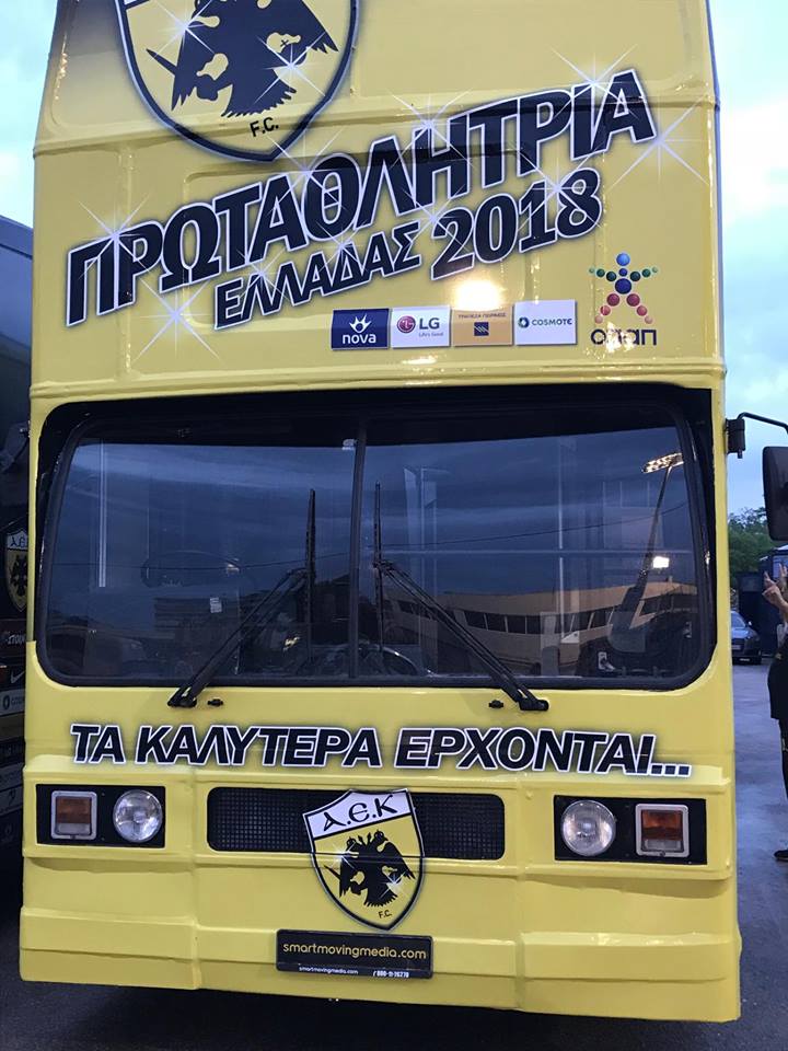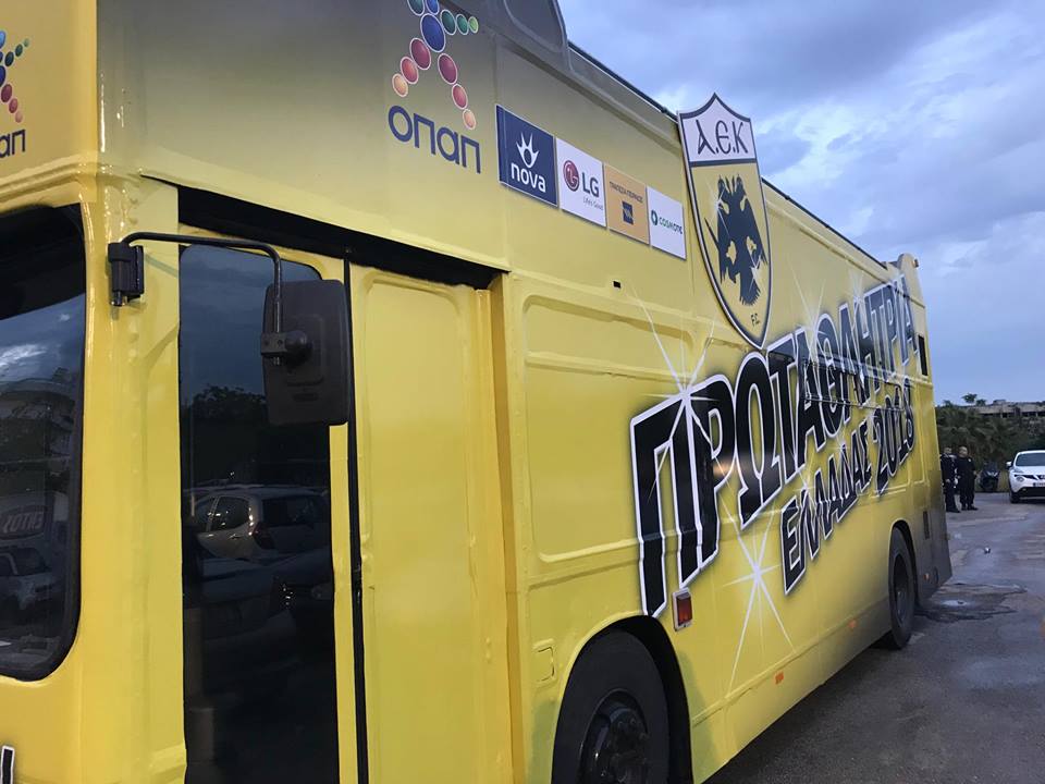 Το ανοικτό πούλμαν στο οποίο θα επιβιβαστούν οι παίκτες της ΑΕΚ για να πανηγυρίσουν την κατάκτηση του πρωταθλήματος στη Νέα Φιλαδέλφεια τους περιμένει…