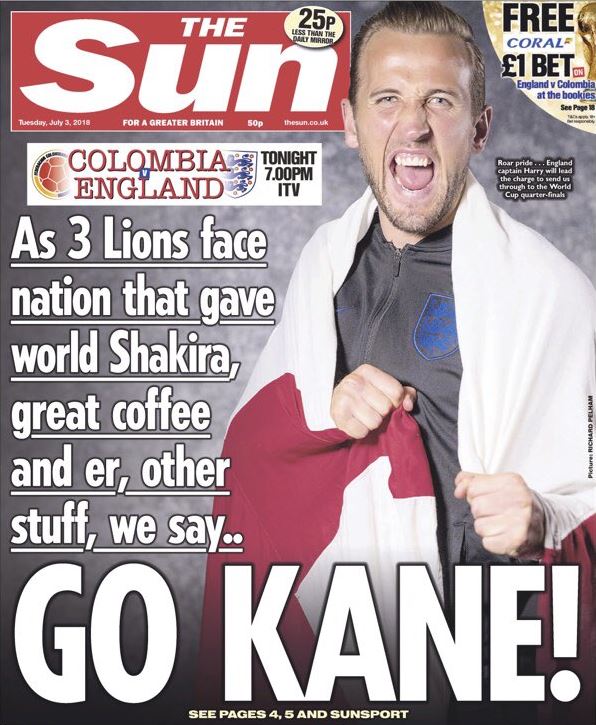 Συγκεκριμένα, το πρωτοσέλιδο αναφέρει: «Τα τρία λιοντάρια αντιμετωπίζουν μία χώρα που έδωσε τον κόσμο την Σακίρα, απίθανο καφέ και κάποια άλλα πράγματα… εμείς λέμε Go Kane».