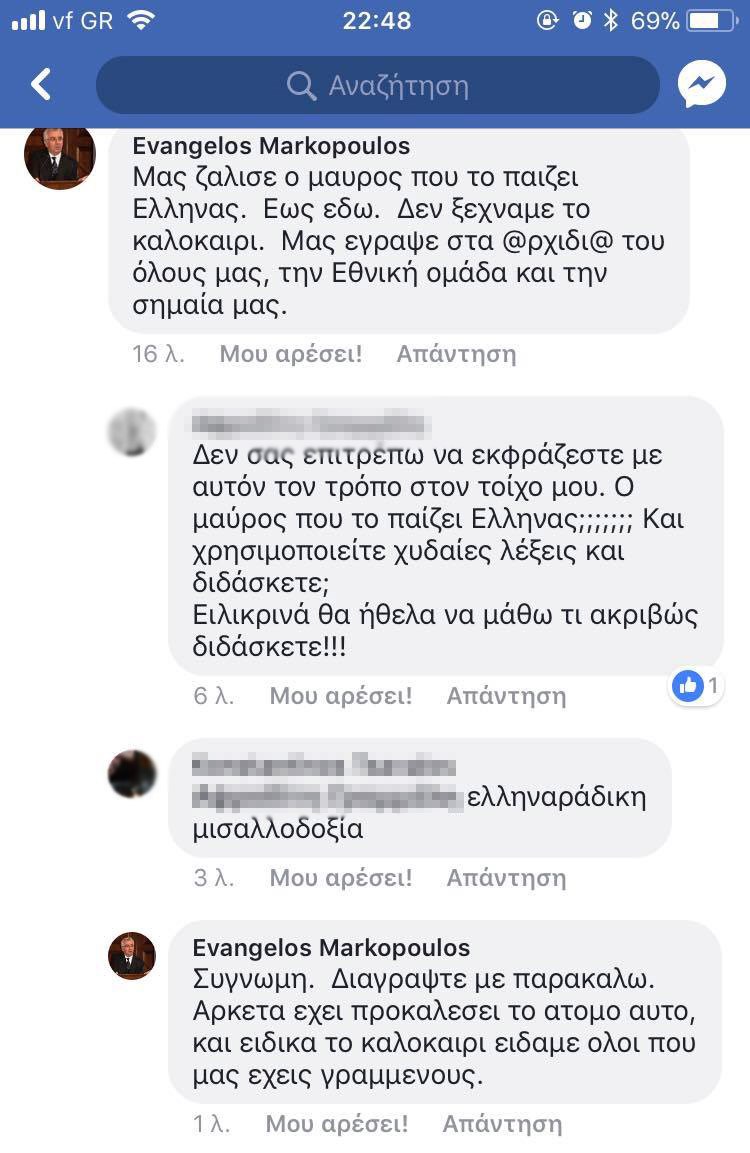 Συγκεκριμένα, σχολίασε: « Μας ζάλισε ο μαύρος που το παίζει Έλληνας. Έως εδώ. Δεν ξεχνάμε το καλοκαίρι. Μας έγραψε στα @ρχιδι@ του όλους μας, την Εθνική ομάδα και την σημαία μας».