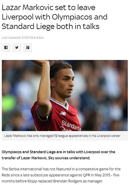 Αυτήν τη φορά το «Sky Sports» φιλοξενεί δημοσίευμα με τίτλο «Ο Λάζαρ Μάρκοβιτς είναι έτοιμος να φύγει από τη Λίβερπουλ, με τον Ολυμπιακό και την Σταντάρ Λιέγης να βρίσκονται σε συζητήσεις»!