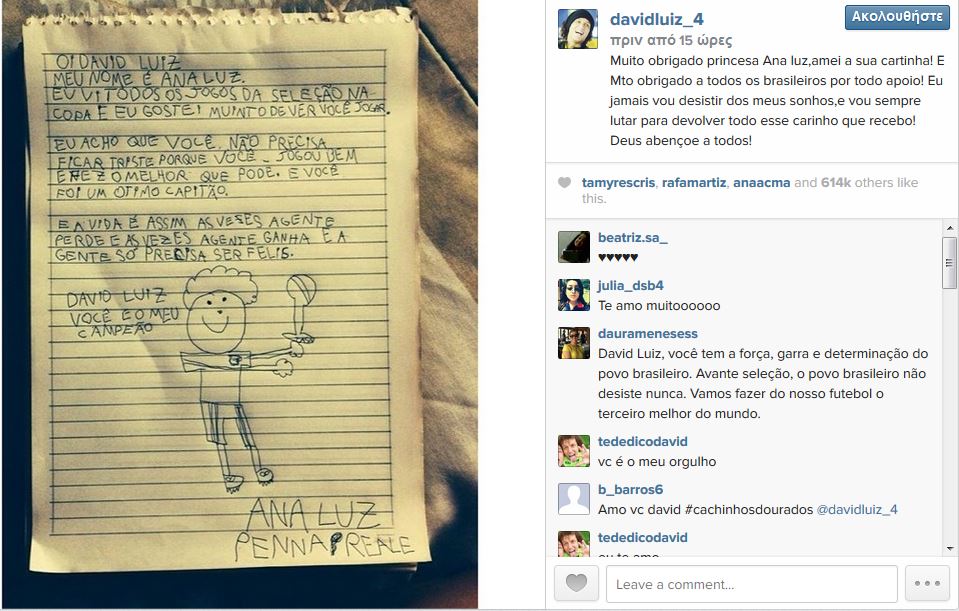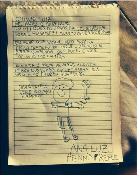 Ο Νταβίντ Λουίζ είχε ξεσπάσει σε λυγμούς μετά την οδυνηρή ήττα με 7-1 με την Γερμανία.To γράμμα ανέβασε ο ίδιος ο Βραζιλιάνος στο Instagram, ευχαριστώντας την μικρή του φίλη αλλά και όλους τους συμπατριώτες του για τη στήριξη τους.