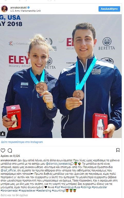 Η Άννα Κορακάκη κατέκτησε τρία μετάλλια στο Παγκόσμιο Κύπελλο Σκοποβολής στις ΗΠΑ, ωστόσο, για εκείνη ιδιαίτερη σημασία είχε αυτό που πήρε με τον αδελφό της Διονύση στο μικτό αγώνισμα του αεροβόλου πιστολιού. Η Χρυσή Ολυμπιονίκης του Ρίο ήταν ιδιαίτερα συγκινημένη, που ανέβηκε στο βάθρο μαζί με τον αδελφό της, όπως φάνηκε και από το σχόλιο που συνόδευσε την φωτογραφία από την απονομή των μεταλλίων.