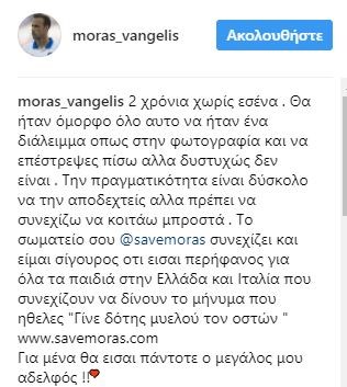 «2 χρόνια χωρίς εσένα. Θα ήταν όμορφο όλο αυτό να ήταν ένα διάλειμμα όπως στη φωτογραφία και να επιστρέψεις πίσω άλλα δυστυχώς δεν είναι. Την πραγματικότητα είναι δύσκολο να την αποδεχθείς άλλα πρέπει να συνεχίζω να κοιτάω μπροστά. Το σωματείο σου “Save Moras” συνεχίζει και είμαι σίγουρος ότι είσαι περήφανος για όλα τα παιδιά στην Ελλάδα και Ιταλία που συνεχίζουν να δίνουν το μήνυμα που ήθελες ‘Γίνε δότης μυελού τον οστών “www.savemoras.com. Για μένα θα είσαι πάντοτε ο μεγάλος μου αδελφός!!» έγραψε χαρακτηριστικά ο Βαγγέλης Μόρας.