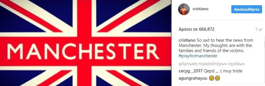 Μέσα από τον προσωπικό του λογαριασμό του instagram, ο σούπερ σταρ της Ρεάλ Μαδρίτης, Κριστιάνο Ρονάλντο εξέφρασε τη λύπη του για την τραγωδία στο Μάντσεστερ .