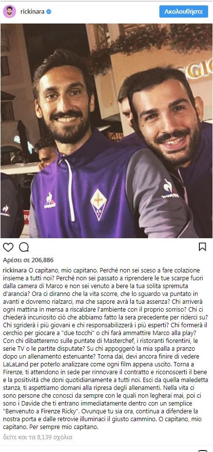 «Βγες από το αναθεματισμένο δωμάτιο». «Γιατί δεν κατέβηκες να φας πρωινό μαζί μας; Γιατί δεν ήρθες να πιεις, κλασικά, έναν χυμό πορτοκάλι; Μας λένε ότι η ζωή συνεχίζεται, ότι πρέπει να κοιτάξουμε μπροστά και να σηκωθούμε ξανά, όμως τη γεύση θα έχει η απουσία σου; Ποιος θα έρχεται κάθε πρωί στο καφέ για να μας ζεστάνει με ένα χαμόγελο; Ποιος θα μας ρωτήσει τι κάναμε το βράδυ και θα αρχίσει να γελάει; Ποιος θα πειράξει τα νέα παιδιά και ποιος θα είναι υπεύθυνος για τους μεγαλύτερους; Ποιος θα φτιάξει τον κύκλο για να παίξουμε με δύο επαφές; Με ποιον θα συζητήσουμε τα επεισόδια στο Masterchef, με ποιον θα δούμε σειρές και τα ματς που παίξαμε; Σε ποιον θα ακουμπήσω ύστερα από ένα εξαντλητικό πρόγραμμα προπόνησης; Γύρνα πίσω, πρέπει να τελειώσεις το ‘La La Land’. Έλα πίσω στην Φλωρεντία, σε περιμένουν να σου ανανεώσουν το συμβόλαιο, αναγνωρίζουν όλα τα καλά πράγματα που μας δίνεις κάθε μέρα. Βγες από το αναθεματισμένο δωμάτιο, σε περιμένουμε για αύριο, όταν ξεκινά η προπόνηση. Στη ζωή, υπάρχουν άνθρωποι που πάντα ήξερες αλλά δεν δέθηκες. Όμως υπάρχουν και αυτοί σαν τον Ντάβιντε, που σε καλωσορίζουν με ένα απλό ‘ καλωσήρθες στην Φλωρεντία Ρίκι’. Όπου κι αν βρίσκεσαι τώρα, συνέχιζε να υπερασπίζεσαι την εστία μας και βάζε μας στον σωστό δρόμο. Για πάντα αρχηγός μου».