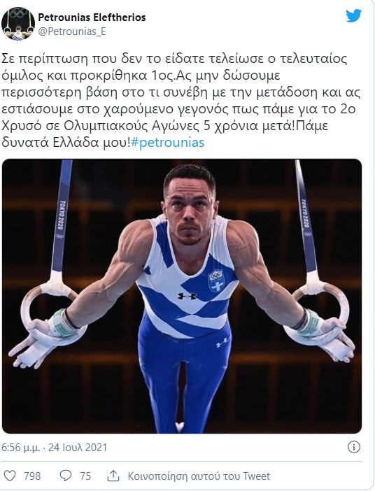 «Σε περίπτωση που δεν το είδατε, τελείωσε ο τελευταίος όμιλος και προκρίθηκα 1ος. Ας μην δώσουμε περισσότερη βάση στο τι συνέβη με την μετάδοση και ας εστιάσουμε στο χαρούμενο γεγονός πως πάμε για το 2ο Χρυσό σε Ολυμπιακούς Αγώνες 5 χρόνια μετά! Πάμε δυνατά Ελλάδα μου!#petrounias», έγραψε χαρακτηριστικά ο “άρχοντας των κρίκων”.