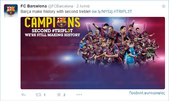 “Η «Μπάρτσα» γράφει ιστορία με το δεύτερο τρέμπλ”, έγραψε στον επίσημο λογαριασμό της στο Twitter η πρωταθλήτρια Ευρώπης για το 2015.