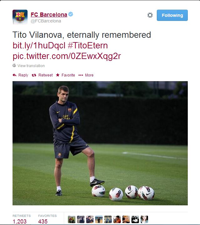 Η Μπαρτελόνα, μέσω του επίσημου λογαριασμού της στο Twitter, θρηνεί την απώλεια του πρώην προπονητή της, Τίτο Βιλανόβα.