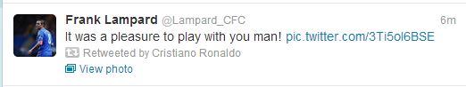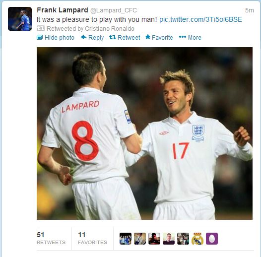 Ο διεθνής Άγγλος ποδοσφαιριστής της Τσέλσι, Φρανκ Λάμπαρντ αναφέρθηκε στο Twitter για την αποχώρηση του Ντέιβιντ Μπέκαμ από την ενεργό δράση.