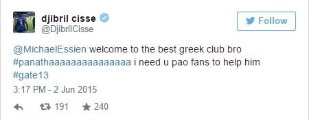 Ο Γάλλος, ο οποίος πριν από λίγες ημέρες ανακοίνωσε ότι αποχωρεί από την ενεργό δράση, καλωσόρισε τον Μίκαελ Εσιέν στον Παναθηναϊκό μέσω twitter.