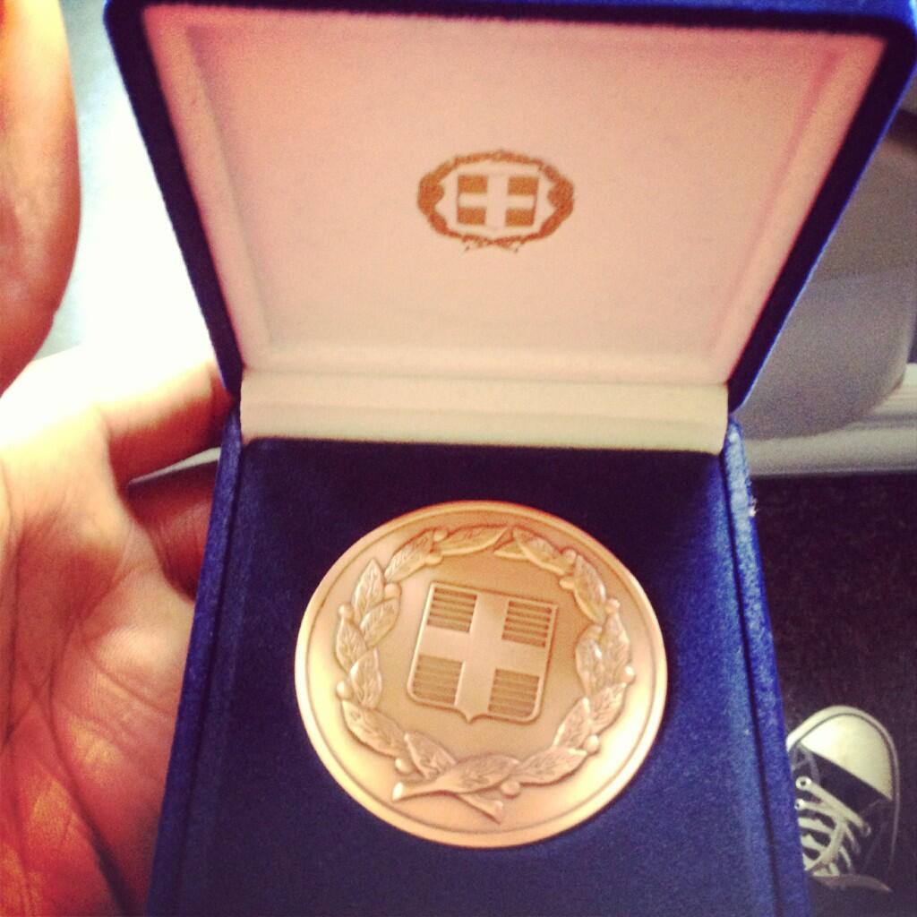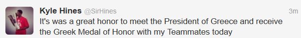 Συγκινημένος για την τιμή, όπως ανέφερε, να γνωρίσει τον Πρόεδρο της Δημοκρατίας Κάρολο Παπούλια εμφανίστηκε ο σέντερ του Ολυμπιακού Κάιλ Χάινς. Μέσω του Twitter, ο πρωταθλητής Ευρώπης, ανέβασε μια φωτογραφία από το μετάλλιο που παρέλαβε από τον κ. Παπούλια στο πλαίσιο της επίσκεψης της ομάδας του στο Προεδρικό Μέγαρο.