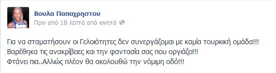 «Δεν συνεργάζομαι με καμιά τουρκική ομάδα» ξεκαθαρίζει μέσω facebook η Βούλα Παπαχρήστου.