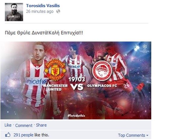 Ο Βασίλης Τοροσίδης ευχήθηκε μέσω Facebook καλή επιτυχία στον Ολυμπιακό στο σημερινό παιχνίδι με τη Μάντσεστερ Γιουνάιτεντ στο Ολντ Τράφορντ.