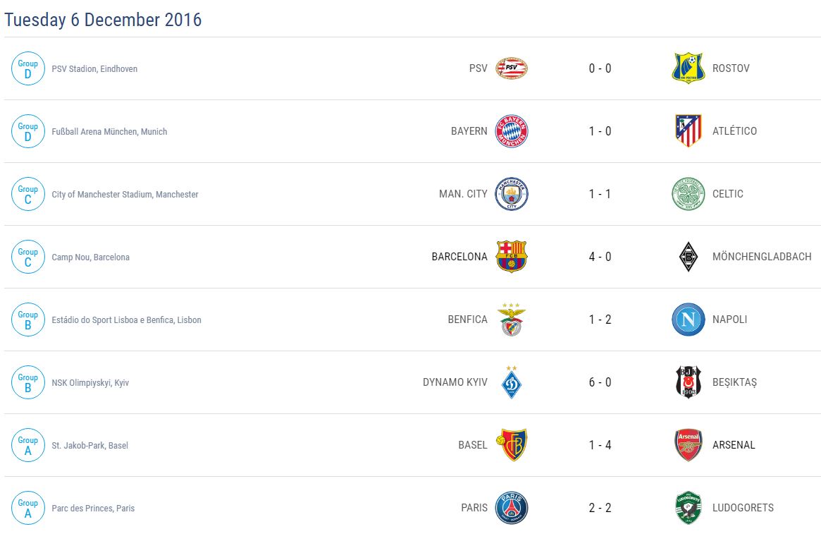 Απο τους σημερινούς αγώνες ξεχωρίζουν οι εμφατικές νίκες της Μπαρτσελόνα, της Άρσεναλ και βεβαίως η συντριβή της Μπεσίκτας στο Κίεβο απο τη Ντιναμό. Δείτε τα αποτελέσματα της ημέρας στην κορυφαία διασυλλογική διοργάνωση: