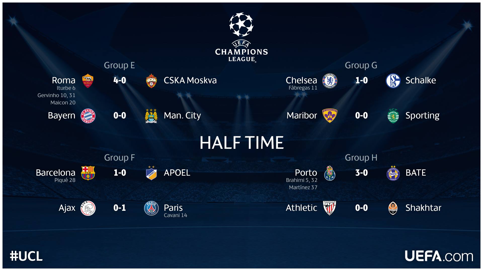 Ο ΑΠΟΕΛ χάνει με 0-1 στο Καμπ Νου από τη Μπαρτσελόνα στο ημίχρονο της αναμέτρησης για την πρεμιέρα των ομίλων του Τσάμπιονς Λιγκ. Συνοπτικά τα αποτελέσματα