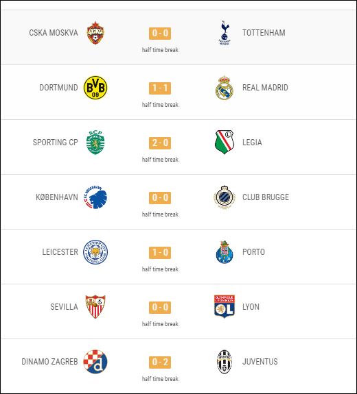 Ισόπαλο 1-1 έληξε το ημίχρονο του παιχνιδιού ανάμεσα στη Ντόρτμουντ και την Ρεάλ για την 2η αγωνιστική των ομίλων του Τσάμπιονς Λιγκ. Αναλυτικά τα αποτελέσματα στο ημίχρονο των οκτώ αναμετρήσεων: