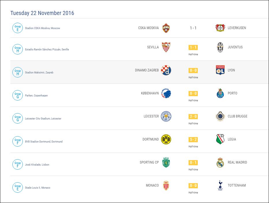 Ισόπαλο 1-1 έληξε το ημίχρονο της αναμέτρησης ανάμεσα στην Σεβίλλη και την Γιουβέντους για την 5η αγωνιστική του Τσάμπιονς Λιγκ. Δείτε τα αποτελέσματα του ημιχρόνου και στα υπόλοιπα παιχνίδια: