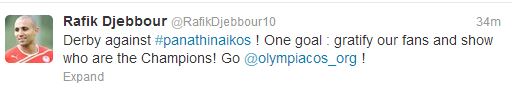 O Αλγερινός άσος των «ερυθρολεύκων», Ραφίκ Τζιμπούρ, λίγες ώρες πριν από το ντέρμπι με τον Παναθηναϊκό, στέλνει το δικό του μήνυμα στους οπαδούς, μέσω twitter.