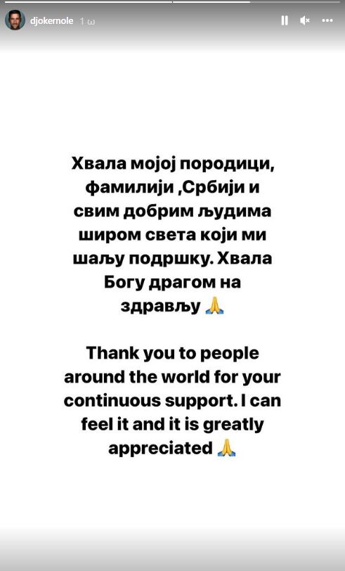 Στη δεύτερη ευχαρίστησε τον κόσμο για την συμπαράστασή του. ““Ευχαριστώ όλο τον κόσμο ανά τον πλανήτη για τη συνεχή σας στήριξη. Μπορώ να την αισθανθώ και την εκτιμώ”, έγραψε χαρακτηριστικά ο Σέρβος τενίστας, ο οποίος έχει εξασφαλίσει ειδική άδεια για να πάρει μέρος στο Australian Open, καθώς είναι ανεμβολίαστος. Βέβαια μετά τα όσα έγιναν τις τελευταίες μέρες η συμμετοχή του στο τουρνουά βρίσκεται στον “αέρα”. Το δικαστήριο μπορεί τη Δευτέρα να αποφασίσει την απέλασή του από τη χώρα.