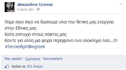 Καλή επιτυχία εύχεται στην Εθνική Ομάδα και ο Αλέξανδρος Τζόρβας. “Πάμε σιγά σιγά να δώσουμε όλοι την θετική μας ενέργεια στην Εθνική μας Καλή επιτυχία στους παίκτες μας