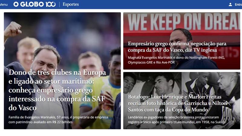 «Ο 57χρονος επιχειρηματίας ξεκίνησε την επαγγελματική του καριέρα στον ναυτιλιακό κλάδο. Η οικογένειά του κατέχει την Capital Maritime Group, η οποία έχει περιουσιακά στοιχεία αξίας 22 δισεκατομμυρίων δολαρίων», σημειώνει μεταξύ άλλων η «O’Globo» στην παρουσίαση του Βαγγέλη Μαρινάκη και αναφέρει για τη διαδρομή του: «Το πρώτο βήμα στο ποδόσφαιρο ήταν η αγορά του Ολυμπιακού το 2010. Από τότε που ανέλαβε τον οικονομικό έλεγχο, ο σύλλογος κέρδισε το εθνικό πρωτάθλημα επτά συνεχόμενες σεζόν, εκτός από το να σηκώσει το Κύπελλο τέσσερις φορές.