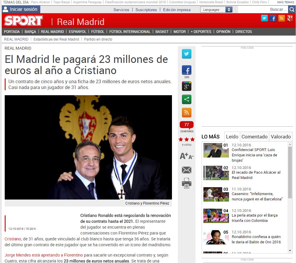 Όπως αναφέρει η ισπανική εφημερίδα, «Sport», η «βασίλισσα» έχει κάνει, ήδη, κίνηση για την πρόωρη ανανέωση του συμβολαίου του Πορτογάλου σταρ, που υπό τις παρούσες συνθήκες λήγει το καλοκαίρι του 2018. Έχει μιλήσει με τον μάνατζερ του παίκτη, Ζόρζε Μέντες για μία νέα συνεργασία έως το 2021, οπότε και ο CR-7 θα είναι 36 ετών προσφέροντας αποδοχές-μαμούθ.
