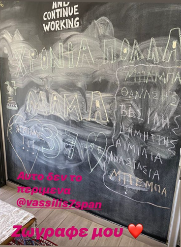 Ιδιαίτερα τρυφερός ο Βασίλης Σπανούλης επεφύλασσε μία ευχάριστη έκπληξη στη σύζυγό του Ολυμπία Χοψονίδου για τα γενέθλιά της σήμερα το πρωί (17/6). Ο αρχηγός του Ολυμπιακού είχε γράψει στον μαυροπίνακα στο σπίτι τους «Χρόνια Πολλά Μαμά», «Σ’ αγαπάμε», ευχές που, όπως φαίνεται, υπογράφουν ο “Kill Bill” και τα έξι παιδιά τους (Μπαμπάς, Θανάσης, Βασίλης, Δημήτρης, Αιμιλία, Αναστασία, Μπέμπα). Ο Σπανούλης θέλησε να μοιραστεί τη χαρά του για τα 37α γενέθλια της συζύγου του και με τους φίλους του στο Instagram, στέλνοντας ως “story” από τον προσωπικό λογαριασμό του μία selfie του ζευγαριού, έχοντας γεμίσει φιλιά το πρόσωπο της Ολυμπίας Χοψονίδου.