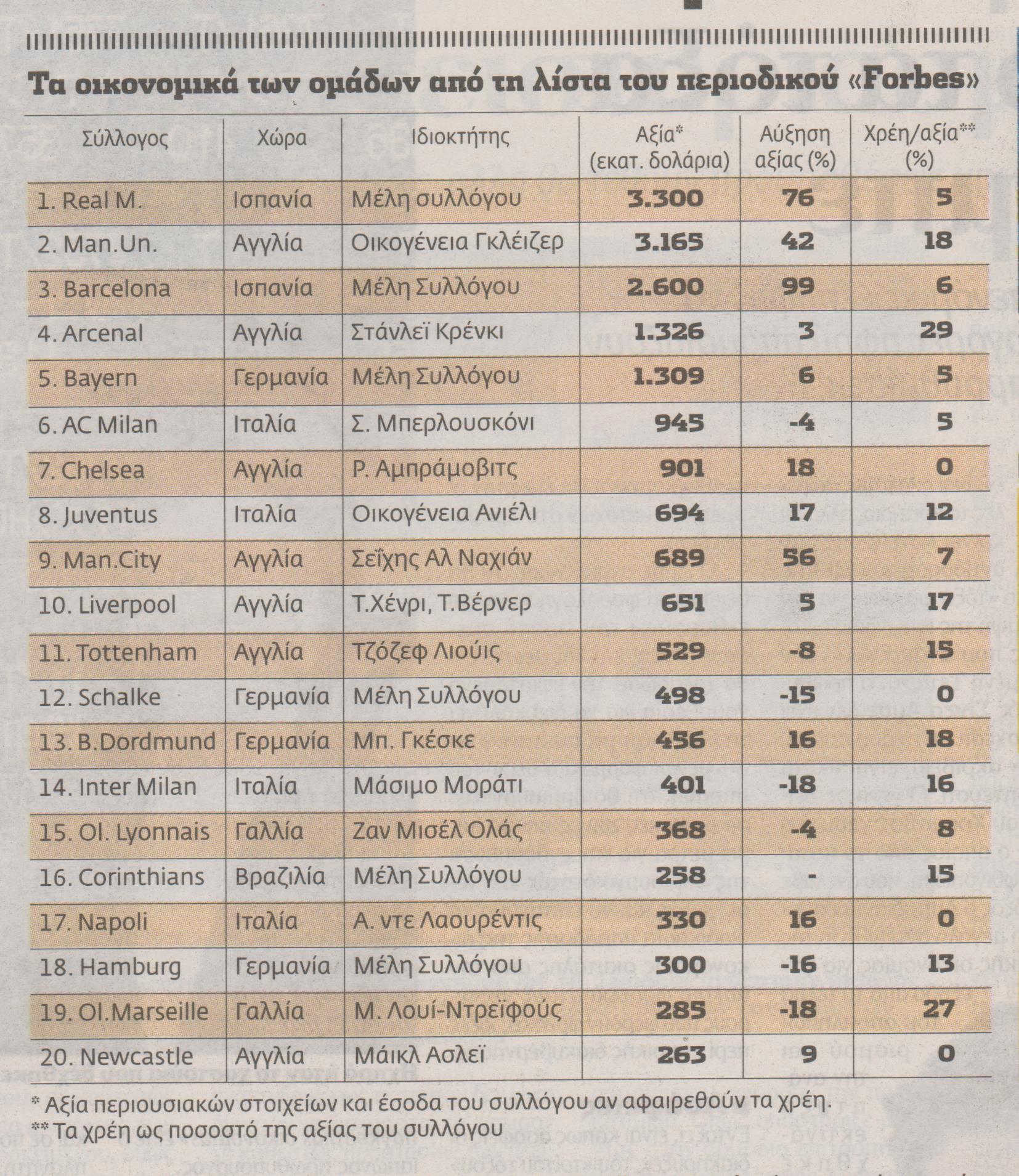 Στον κόσμο του σύγχρονου επαγγελματικού ποδοσφαίρου, αν οι νίκες στα γήπεδα δεν μετατρέπονται σε χρήματα στα ταμεία, υπάρχει πρόβλημα εταιρικής διακυβέρνησης. Από το 2004 το ειδικευόμενο στις success stories αμερικανικό περιοδικό Forbes καταγράφει τις καλύτερες ποδοσφαιρικές ομάδες της υφηλίου με βάση όχι την αγωνιστική αλλά την οικονομική απόδοσή τους.