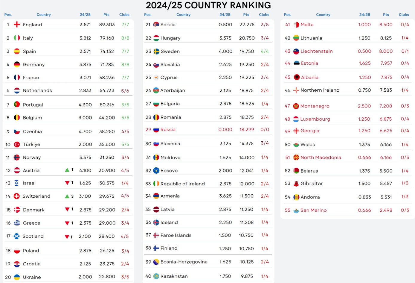 Δύο ημέρες πριν από τους κρίσιμους αγώνες ρεβάνς των ευρωπαϊκών διοργανώσεων, η Ελλάδα υποχώρησε κατά μία θέση στην κατάταξη της UEFA, επηρεάζοντας άμεσα τις ελπίδες των ομάδων της για ευρωπαϊκή διάκριση.