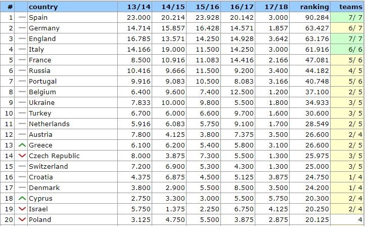 Η Ελλάδα βρίσκεται τώρα στη 13η θέση, καθώς η Αυστρία ανέβηκε στη 12η έχοντας ωστόσο τους ίδιους βαθμούς και επίσης δύο ομάδες να συνεχίζουν στην Ευρώπη.