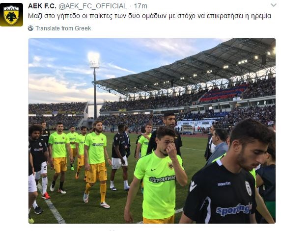 Οι ποδοσφαιριστές του ΠΑΟΚ και της ΑΕΚ βγήκαν μαζί στον αγωνιστικό χώρο του Πανθεσσαλικού σε μια προσπάθεια να ηρεμήσουν οι οπαδοί των δύο ομάδων και να αρχίσει ο τελικός του Κυπέλλου.