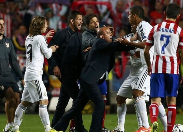 Ο Γάλλος αμυντικός, μετά το εύστοχο πέναλτι του Κριστιάνο Ρονάλντο, κλώτσησε τη μπάλα προς τον πάγκο των «ροχιμπλάνκος», με τον Ντιέγκο Σιμεόνε να απαντά, και με δικό του σουτ να την στέλνει πάνω στον νεαρό παίκτη της «βασίλισσας». Στη συνέχεια ο προπονητής της πρωταθλήτριας Ισπανίας μπήκε με φόρα στον αγωνιστικό χώρο και τα έβαλε με τον Ραφαέλ Βαράν.