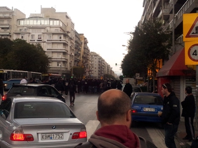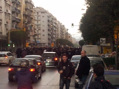 Οι διαδηλωτές, που ξεκίνησαν από το άγαλμα του Βενιζέλου, μέσω της οδού Εγνατία, θα φθάσουν στο γήπεδο της Τούμπας όπου, στις 7.30 το απόγευμα, υποδέχονται τον Ολυμπιακό για το μεγάλο ντέρμπι της ημέρας.