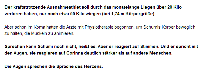 Σύμφωνα με ρεπορτάζ της Bild, ο Γερμανός παγκόσμιος πρωταθλητής ζυγίζει μόλις 55 κιλά. Αυτό σημαίνει ότι έχει χάσει 20 κιλά, κάτι βέβαια που είναι απόλυτα φυσιολογικό μετά από παραμονή έξι μηνών στην εντατική. Όπως αναφέρει η εφημερίδα, ο «Σούμι» ανταποκρίνεται στο περιβάλλον και επικοινωνεί με τα μάτια κυρίως με την σύζυγο του, την Κορίνα.