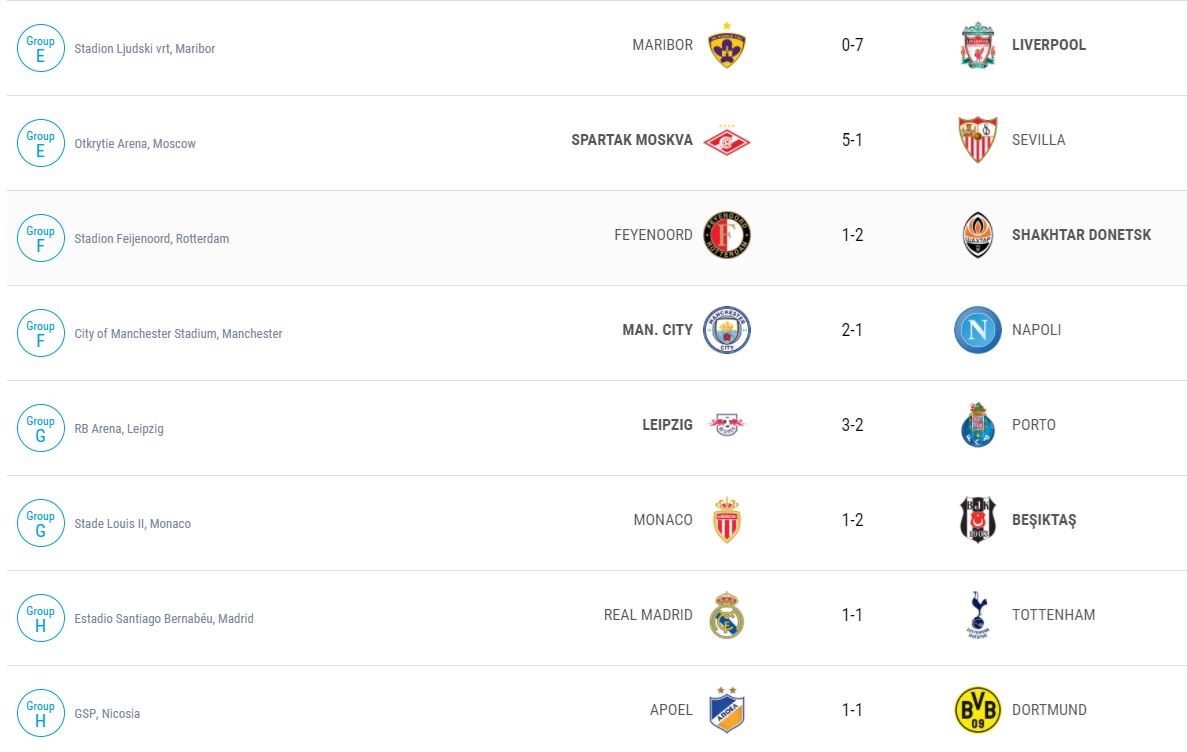 Βροχή από γκολ είχαμε στην σημερινή αγωνιστική του Τσάμπιονς Λιγκ. Με την επιθετική τριάδα των Φιρμίνο, Σαλάχ και Κουτίνο σε εξαιρετική κατάσταση, η Λίβερπουλ διέλυσε την Μάριμπορ με σκορ 7-0. Η Σπαρτάκ συνέτριψε την Σεβίλλη στην Μόσχα, ενώ η Νάπολι δεν κατάφερε να σταθεί εμπόδιο στην Μάντσεστερ Σίτι του Πεπ Γκουαρντιόλα. Η Ρεάλ συνέχισε τις κακές φετινές εμφανίσεις της, και παραχώρησε ισοπαλία 1-1 στην Τότεναμ μέσα στο Σαντιάγο Μπερναμπέου.