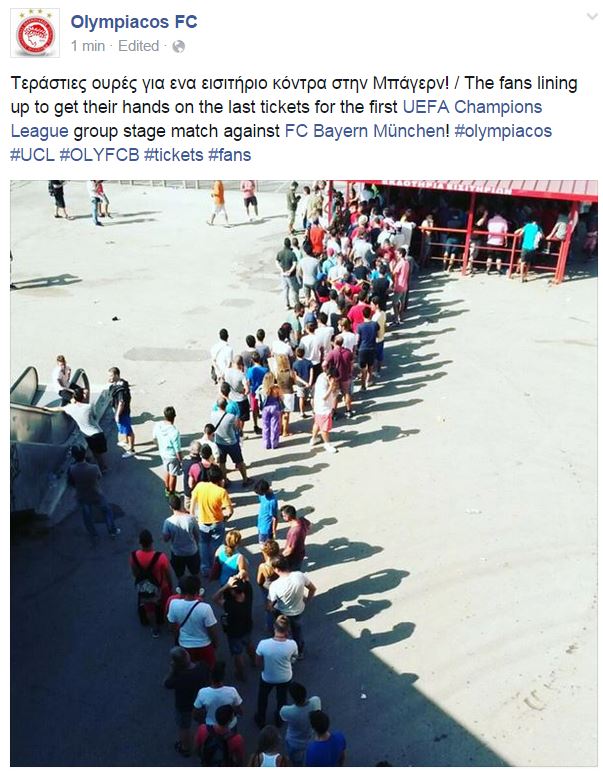 Τεράστιες ουρές σχηματίζουν από το πρωί έξω από τα εκδοτήρια του Γ. Καραϊσκάκης οι οπαδοί του Ολυμπιακού, για ένα «μαγικό χαρτάκι» ενόψει της αναμέτρησης με την Μπάγερν Μονάχου στην πρεμιέρα του φετινού Champions League.