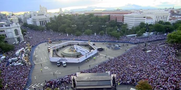 Χιλιάδες Μαδριλένοι συγκεντρώθηκαν και απόψε στο… γνωστό μέρος για να πανηγυρίσουν ακόμα μία μεγάλη επιτυχία της Ρεάλ Μαδρίτης. Η διαφορά σε σχέση με τα προηγούμενα χρόνια είναι ότι η Plaza de Cibeles φόρεσε ξανά τα γιορτινά της και έστησε τρελό πάρτι για δεύτερη φορά μέσα σε δύο εβδομάδες. Μόλις στις 22 Μαΐου, στην επιστροφή της Ρεάλ από τη Μάλαγα, η πλατεία φωταγωγήθηκε ξανά και δεκάδες χιλιάδες φίλοι των «μερένχες» πανηγύρισαν την κατάκτηση του πρωταθλήματος.