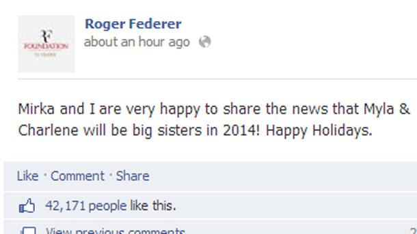 Ο Ρότζερ Φέντερερ ελπίζει ότι το 2014 θα μεγαλώσει η λίστα των ρεκόρ του, αλλά το βέβαιο είναι ότι θα μεγαλώσει η οικογένειά του. Όπως ανακοίνωσε μέσω Facebook και Twitter «η Μάιλα και η Σαρλίν θα γίνουν μεγάλες αδερφές το 2014! Καλές γιορτές…».