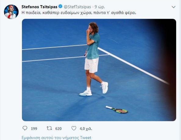 Εκτός από τένις, ο Στέφανος Τσιτσιπάς θα μας μάθει και τα ρητά σπουδαίων αρχαίων Ελλήνων φιλοσόφων.Μετά τα λόγια του Αριστοτέλη για την πρόκρισή του στους «16» του Australian Open, ακολούθησε ο… Σωκράτης.Συγκεκριμένα, έγραψε στο twitter:«Η παιδεία, καθάπερ ευδαίμων χώρα, πάντα τ’ αγαθά φέρει», που σημαίνει:«Η μόρφωση, όπως ακριβώς μια εύφορη γη, φέρνει όλα τα καλά».