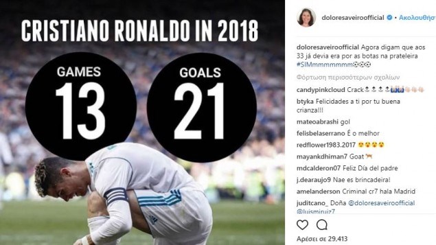 Μετά και τα τέσσερα γκολ που σημείωσε ο Ρονάλντο στη νίκη με 6-3 επί της Ζιρόνα, η κυρία Ντολόρες ανέβασε μια φωτογραφία στην οποία αναφερόταν ότι ο γιος της έχει πετύχει 21 γκολ σε 13 παιχνίδια και έγραψε:
