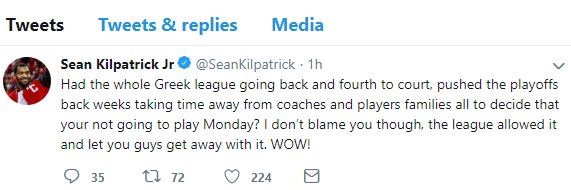 Ο Αμερικανός άσος του Παναθηναϊκού ΟΠΑΠ, Σον Κιλπάτρικ σχολίασε τα όσα συμβαίνουν τις τελευταίες εβδομάδες στο ελληνικό μπάσκετ και ξέσπασε στα social media στρέφοντας τα βέλη του ενάντια στον Ολυμπιακό και την απόφασή του να μην αγωνιστούν τελικά στα πλέι οφ.