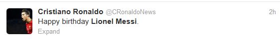Ο άσος της Μπαρτσελόνα, Λιονέλ Μέσι, κλείνει σήμερα τα 25 του χρόνια. Το Twitter του, έχει γεμίσει με ευχές οπαδών και φίλων, ανάμεσα στους οποίους και ο Κριστιάν Ρονάλντο, ενώ η Μπαρτσελόνα τίμησε το μεγάλο της αστέρι με ένα βίντεο – αφιέρωμα.”Χρόνια Πολλά”, εύχεται ο Κριστιάν Ρονάλντο στον Λιονέλ Μέσι, για τα γενέθλιά του, από το twitter.