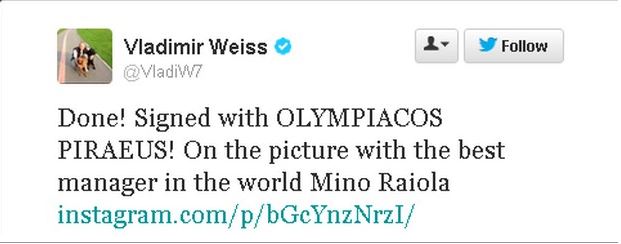 Ο Σλοβάκος άσσος Βλαντιμίρ Βάις ενημέρωσε τους φίλους του μέσω του twitter, ότι ολοκληρώθηκε η συμφωνία με τον Ολυμπιακό και υπέγραψε το συμβόλαιο. Αργότερα αναμένονται ανακοινώσεις από την πειραϊκή ΠΑΕ.