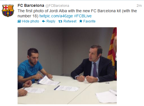 Το νέο αστέρι της Μπαρτσελόνα ακούει στο όνομα Τζόρντι Άλμπα και η ομάδα τον καλωσορίζει με μία φωτογραφία στο twitter, τη στιγμή που υπογράφει το νέο του συμβόλαιο με τον πρόεδρο Σάντο Ροσέ.Η φανέλα του Άλμπα, θα έχει το νούμερο 18.
