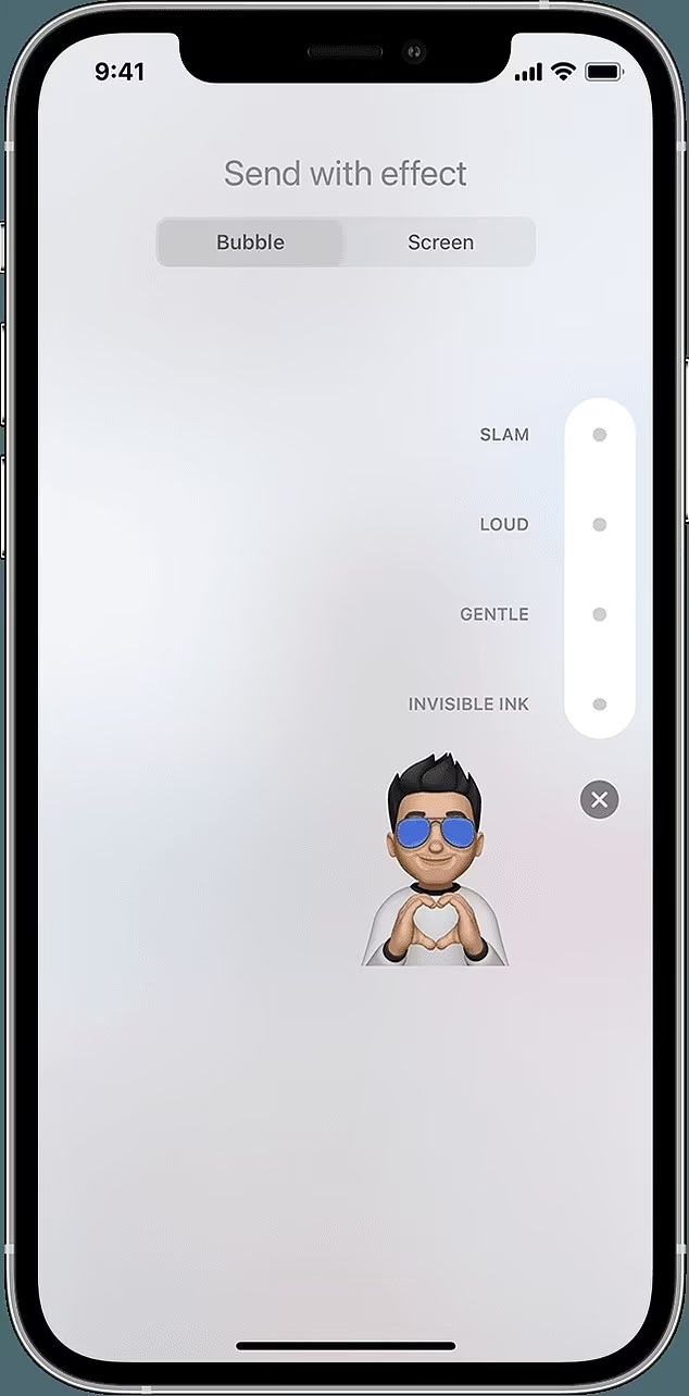 Για να προσθέσετε εφέ, πατήστε παρατεταμένα το κουμπί Αποστολή σε ένα μήνυμα, επιλέξτε ένα εφέ φυσαλίδων ή επιλέξτε Οθόνη και επιλέξτε ένα κινούμενο σχέδιο. Στη συνέχεια, πατήστε Αποστολή.
