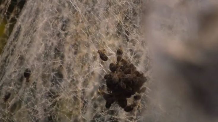 Στο βίντεο, περισσότερες από 1.000 νεαρές αφρικανικές αράχνες του είδους Stegodyphus dumicola, σέρνονται έξω από τη φωλιά τους αναζητώντας το επόμενο γεύμα τους. Οι νεαρές φαίνεται να παίζουν ένα μακάβριο παιχνίδι “αγαλμάτων” καθώς κινούνται, πριν ξαφνικά παγώσουν και στη συνέχεια κινηθούν ξανά όλες μαζί.