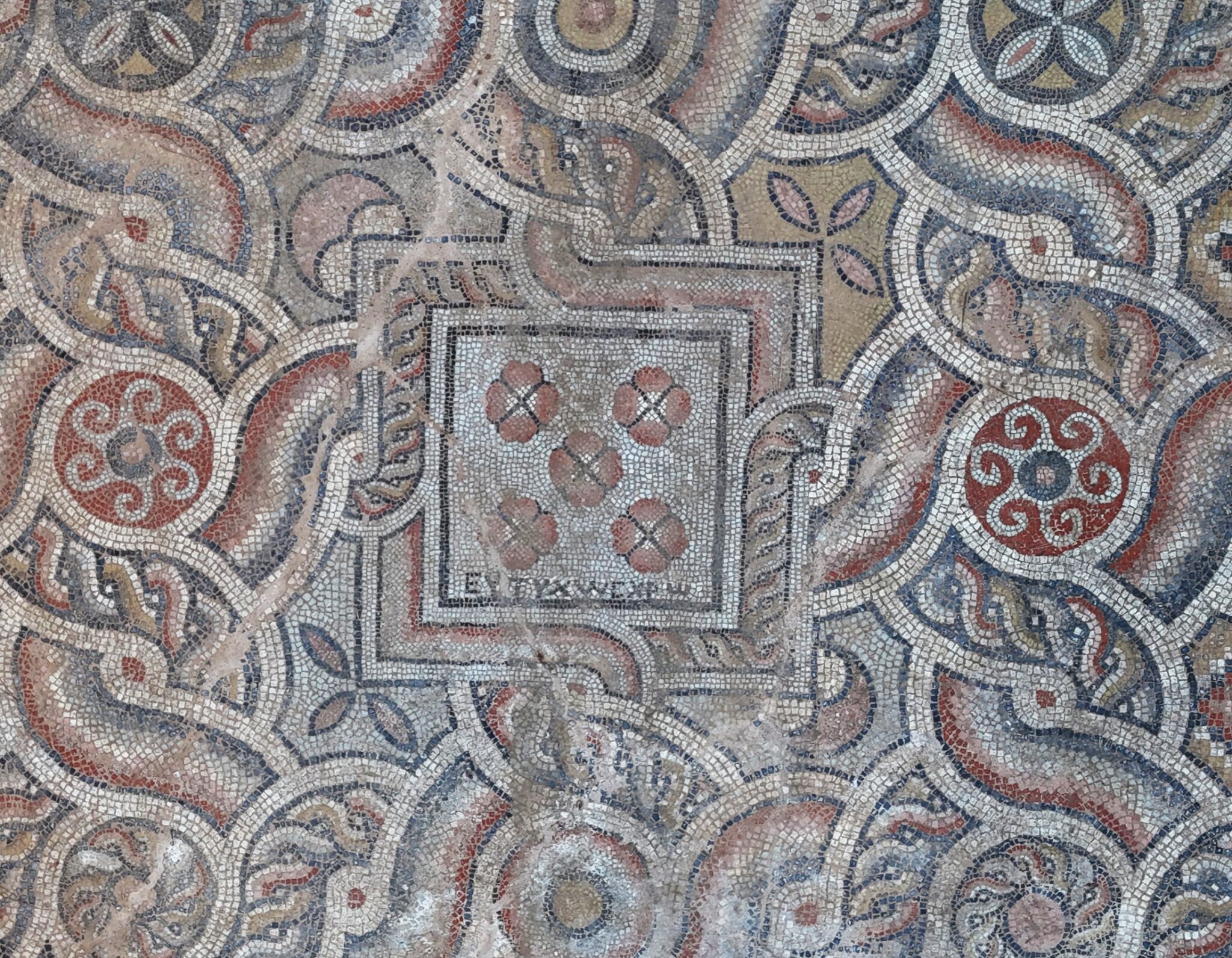 Το ψηφιδωτό, το οποίο κοσμείται με γεωμετρικά και φυτικά μοτίβα καθώς και δύο ενδιαφέρουσες ελληνικές επιγραφές, τράβηξε την προσοχή για τα αναπάντεχα παιχνιδιάρικα μηνύματά του: «Χρώ με χαρά» (Χρησιμοποίησέ το με χαρά) και μια φράση που μεταφράζεται ελεύθερα ως «Σκάσε από τη ζήλια σου, φθονερέ».