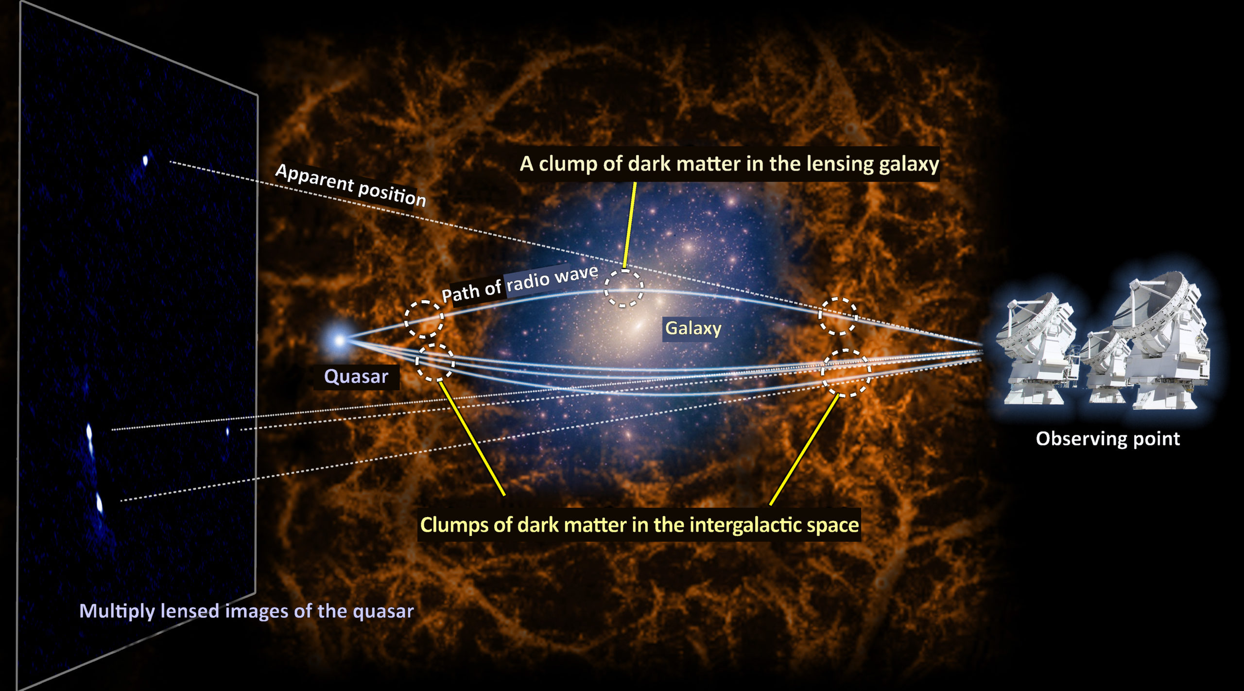 Σε αυτό το σύστημα το αντικείμενο στο προσκήνιο σχηματίζει όχι μία, αλλά τέσσερις εικόνες του αντικειμένου του υποβάθρου λόγω της βαρυτικής δύναμης ενός τεράστιου γαλαξία που επιδρά στο φως. Με τη βοήθεια μιας νέας μεθόδου ανάλυσης των δεδομένων, η ομάδα κατάφερε να ανιχνεύσει διακυμάνσεις στην κατανομή της σκοτεινής ύλης με μεγαλύτερη ανάλυση από ποτέ, σε κλίμακα 30.000 ετών φωτός.